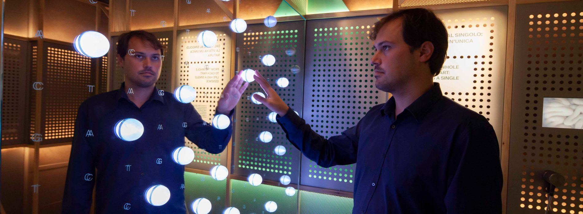 This room focuses on the complex system of relations that unites human health, nature and society and the many research activities that highlight these relationships. Video-mapped scientific flasks and microscope slides activate multimedia footage that is projected onto the walls, returning information on the various laboratories in which the natural molecular complexes are studied as far as their interaction with the human body. An interactive light installation lets us explore the profound connections between humans and nature through touch. We experience and discover that everything is connected.