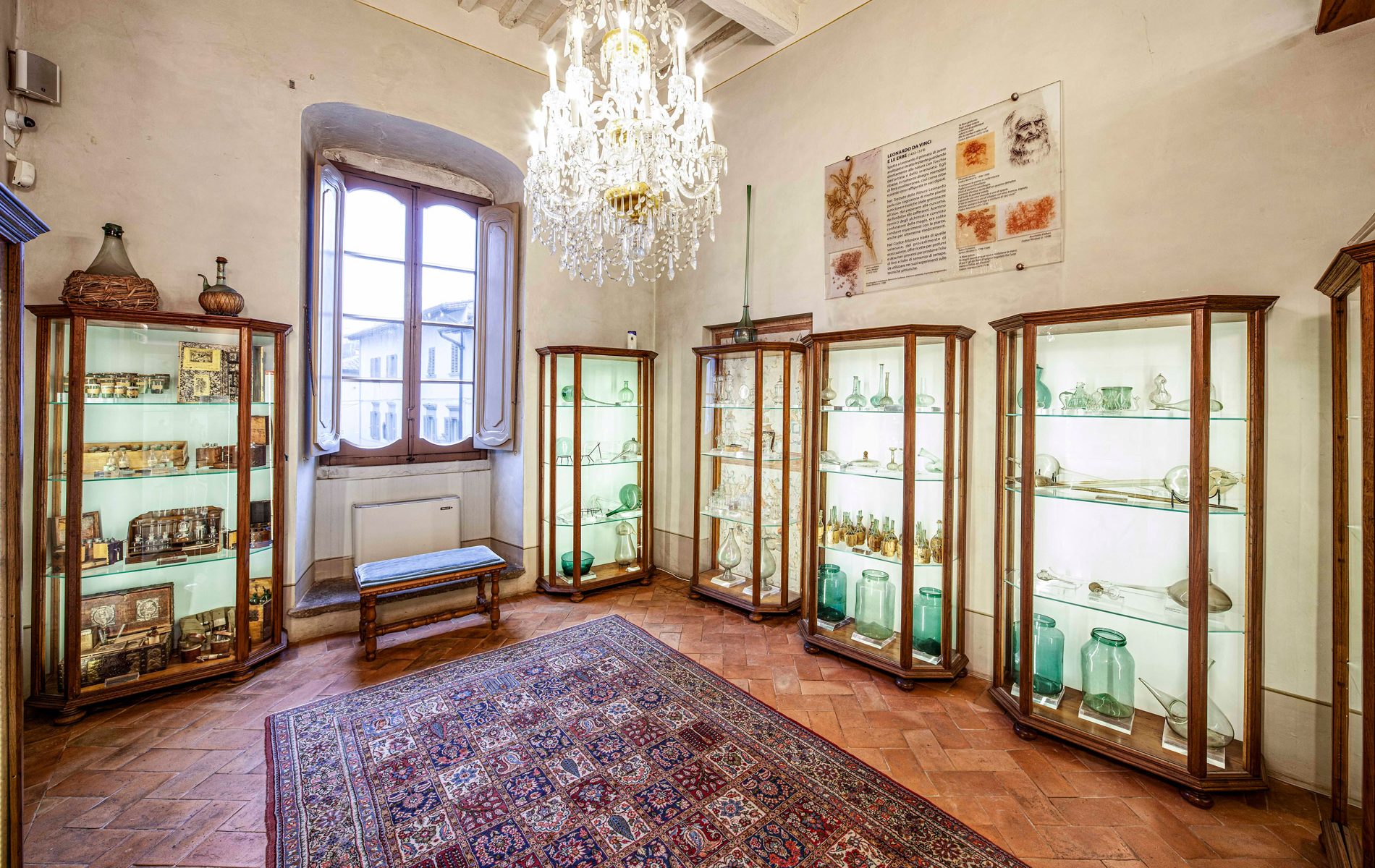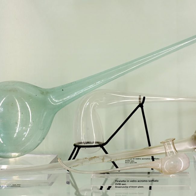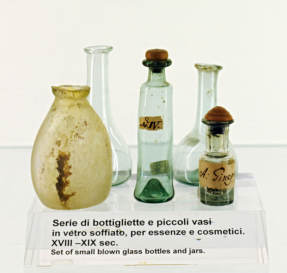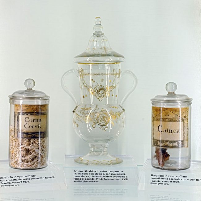 Il vetro, materiale facilmente modellabile, si è sempre prestato per realizzare le dotazioni della farmacia, compresi numerosi strumenti per il laboratorio