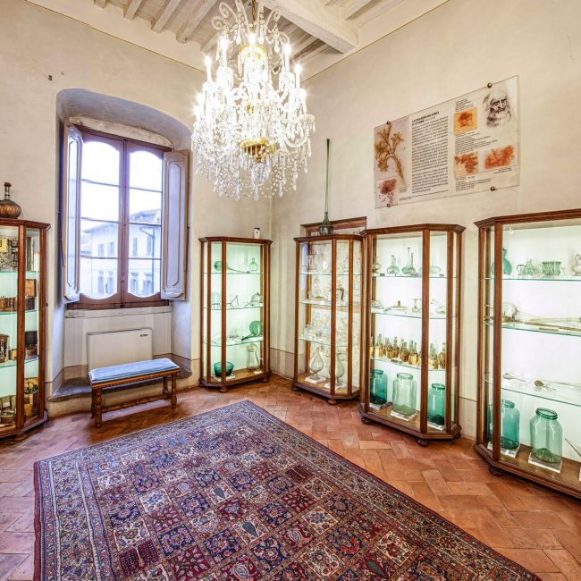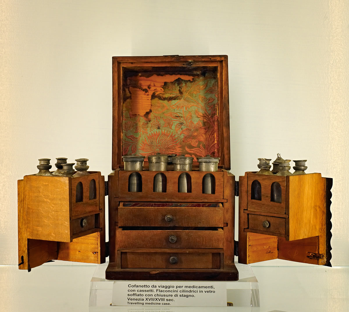 Inoltre, si può osservare una collezione di rare farmacie da viaggio, che venivano usate da medici e speziali per trasportare i preziosi medicamenti.
