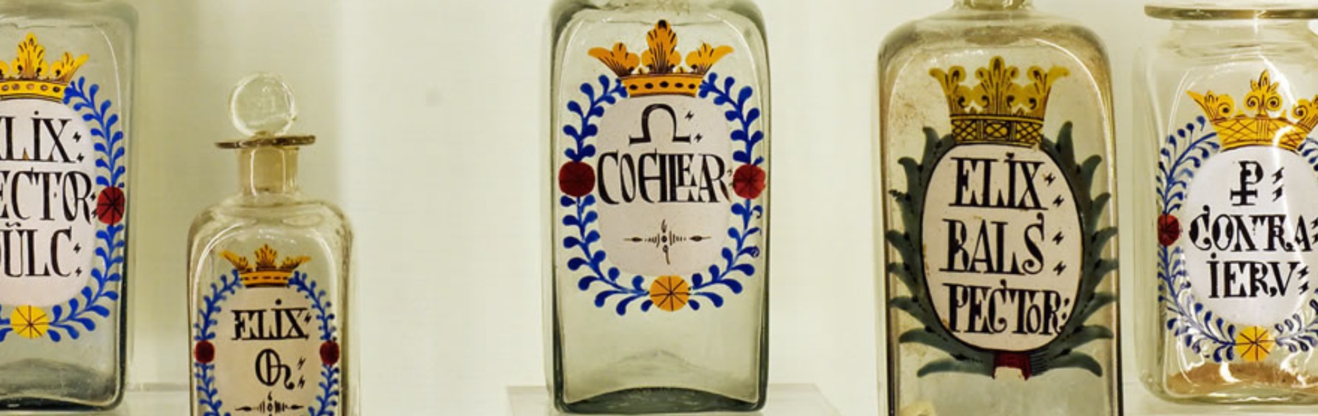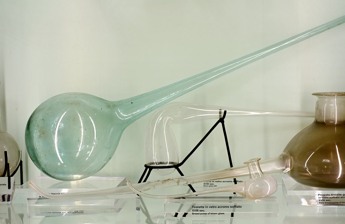 Il vetro soffiato, così modellabile e lucente, si è sempre prestato per realizzare le dotazioni della farmacia, compresi numerosi strumenti per il laboratorio.