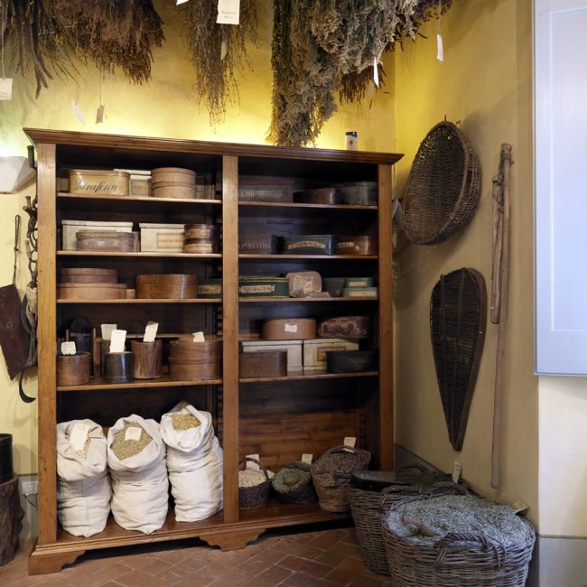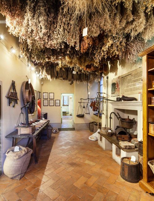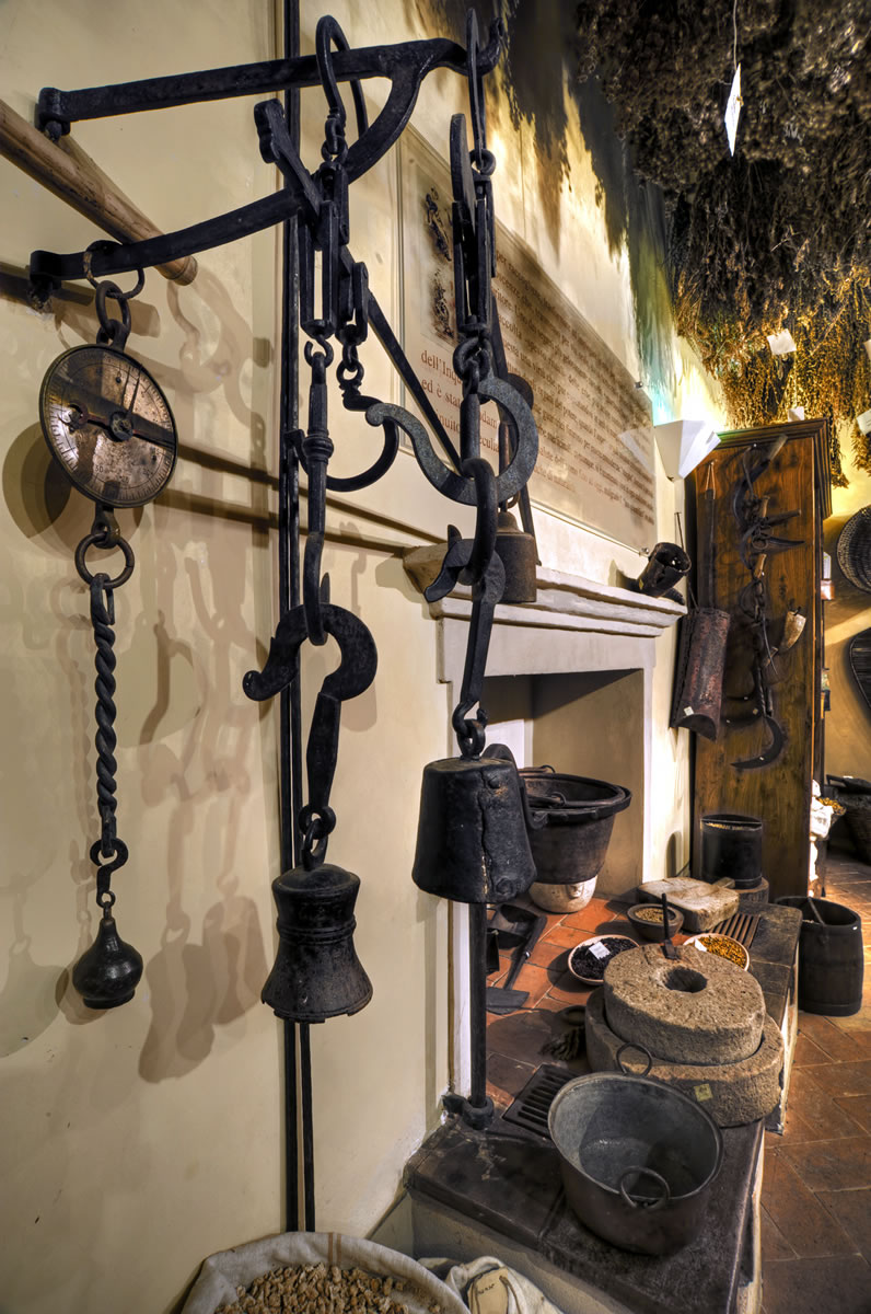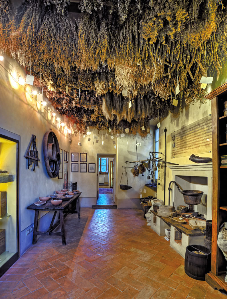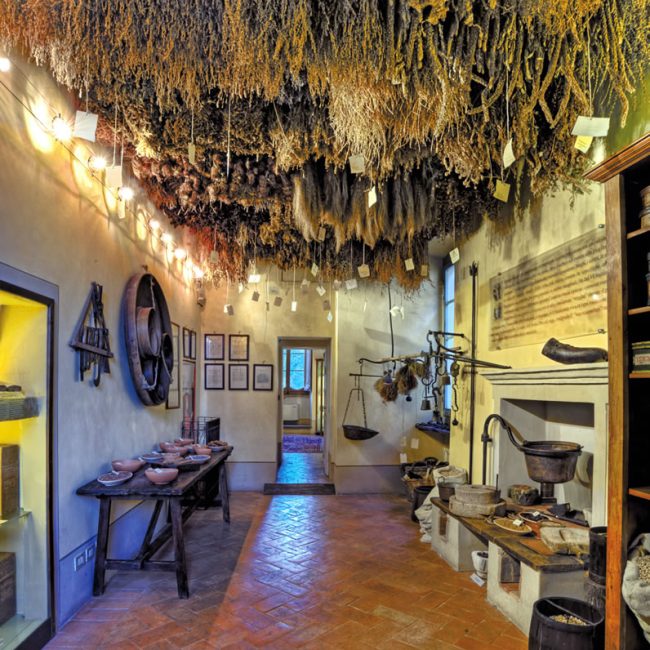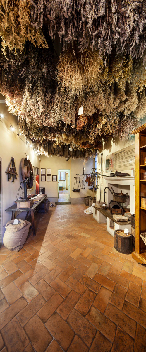Si accede poi all’ambiente più suggestivo di tutto il museo, la stanza delle erbe. Una corposa serie di mazzi di piante medicinali appese a essiccare rende il soffitto un variopinto e profumato tappeto erboso.
