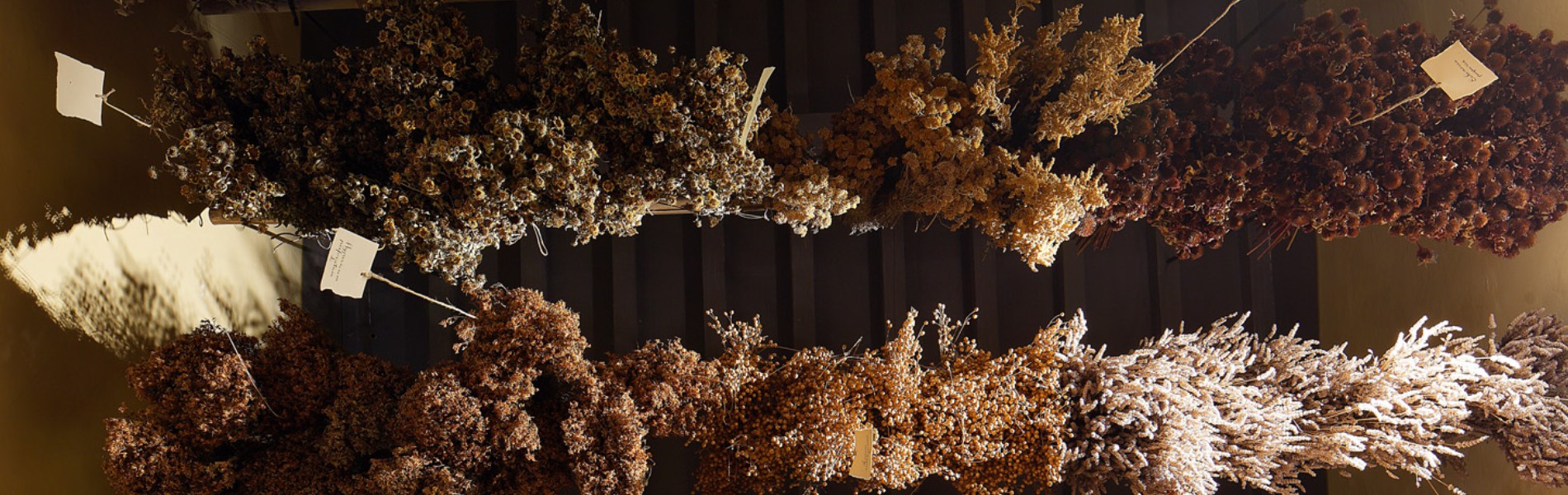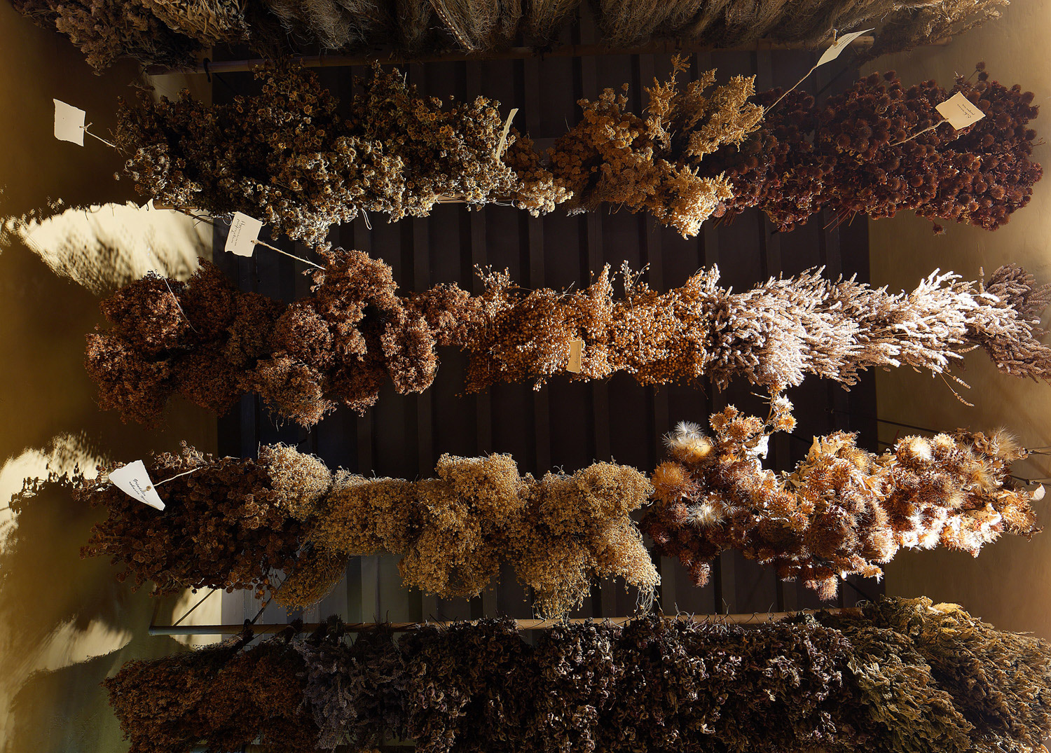 Una numerosa serie di piante medicinali, composte in mazzi ed appese ad essiccare, rendono il soffitto un variopinto e profumato tappeto erboso