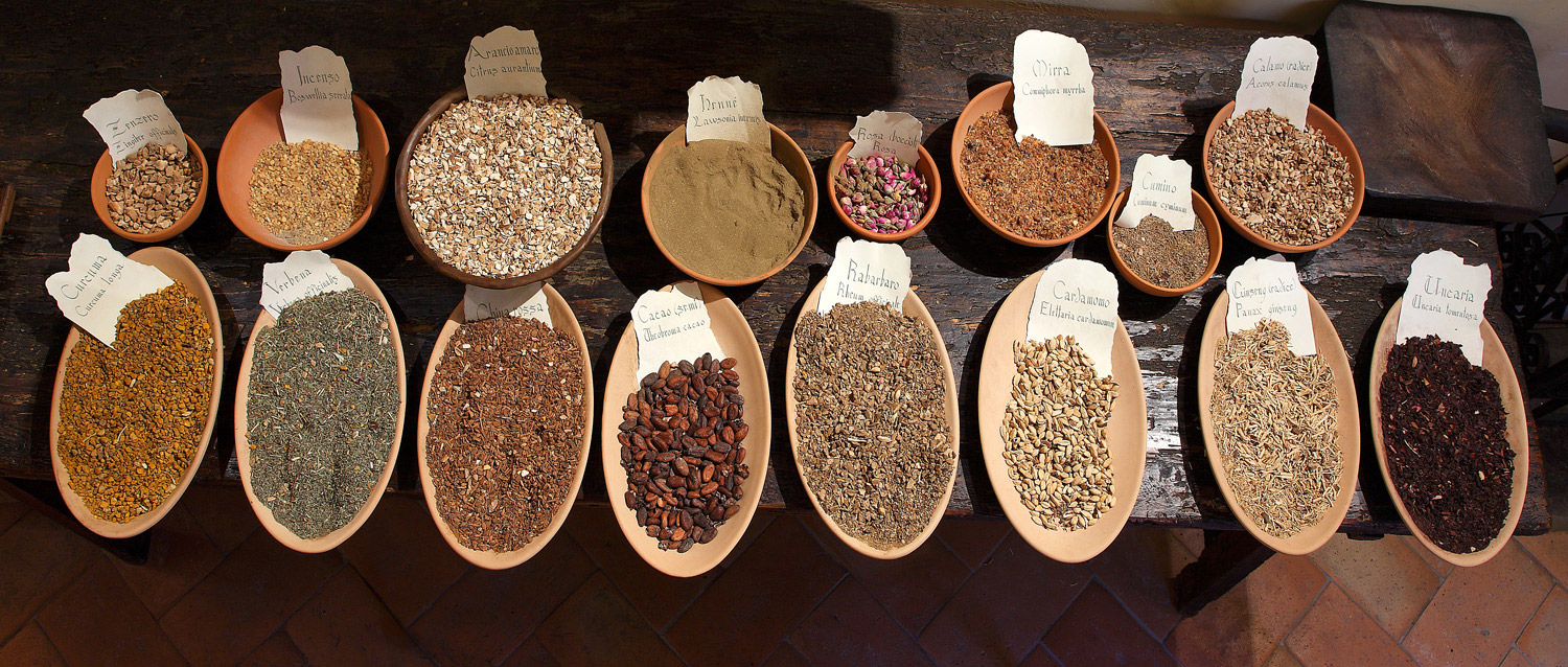 Appese in ambienti asciutti e arieggiati, al riparo dalla luce diretta del sole, le erbe venivano fatte essiccare e subivano i cambiamenti che le preparavano ad essere ridotte in prodotti medicinali. Le erbe venivano poi conservate in appositi contenitori come cesti di vimini e preziose scatole in legno, finemente decorate con cartigli riportanti il nome della pianta.